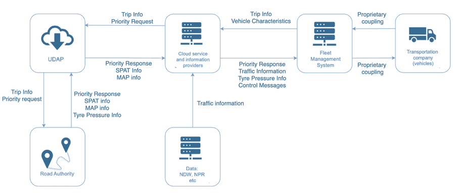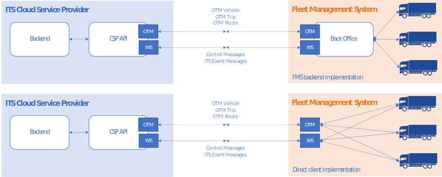 The communication between ITS cloud service provider and logistical IT supplier (typically Fleet Management System-supplier of the in-truck solution) runs through two different syntax solutions (Open Trip Model and Protocol buffers) and two different connections (REST API and WebSocket):